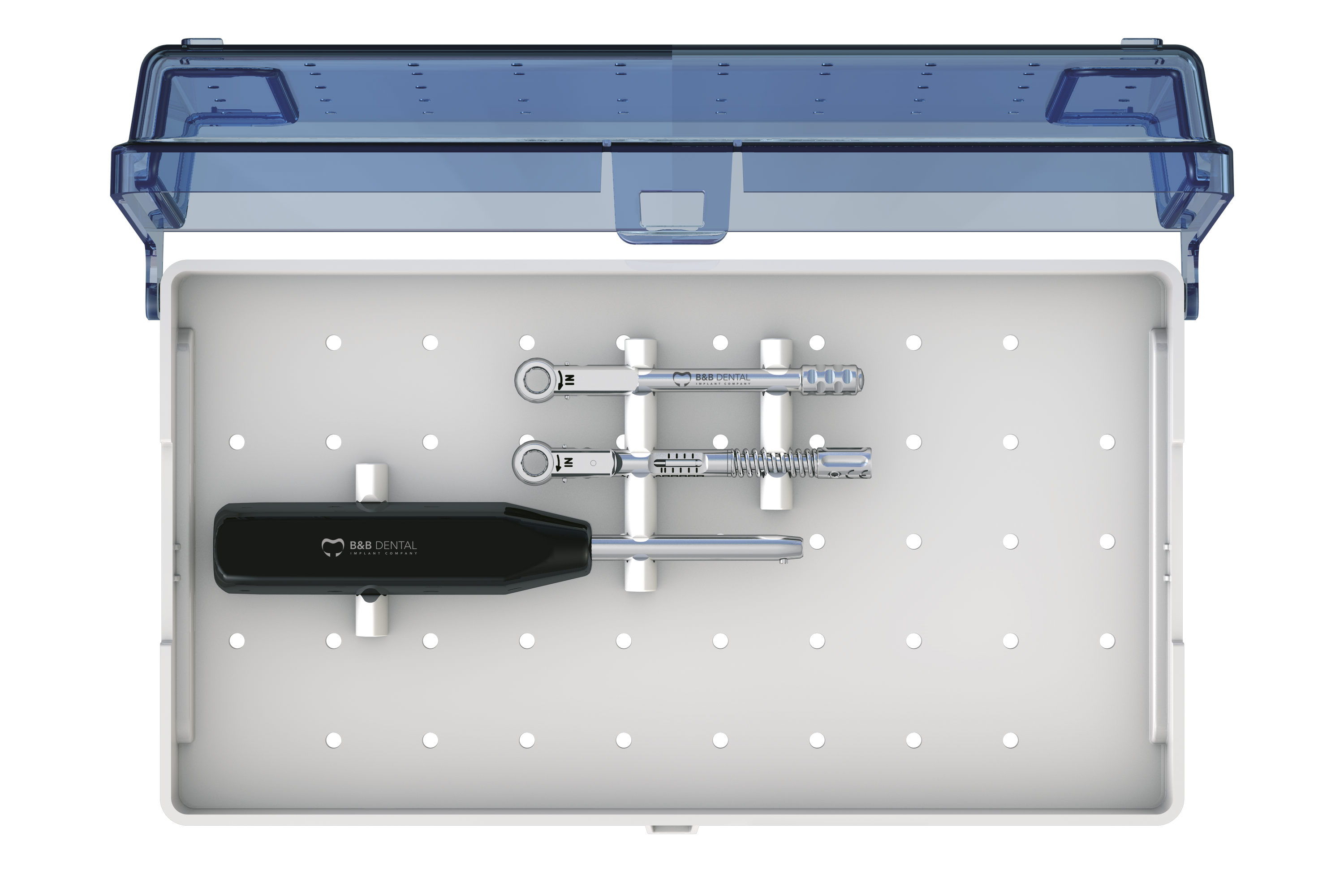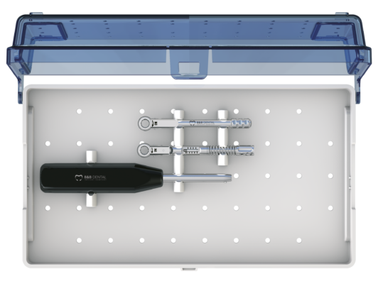 Продуманное эргономичное расположение и яркая цветовая маркировка гнезд элементов набора навигационной хирургии B&B Dental позволяют врачу быстро и без ошибок выбрать именно тот инструмент, который необходим в данную секунду. Это помогает хирургу-стоматологу дополнительно сократить время операции и не допускать ошибок, связанных с путаницей хирургических инструментов.