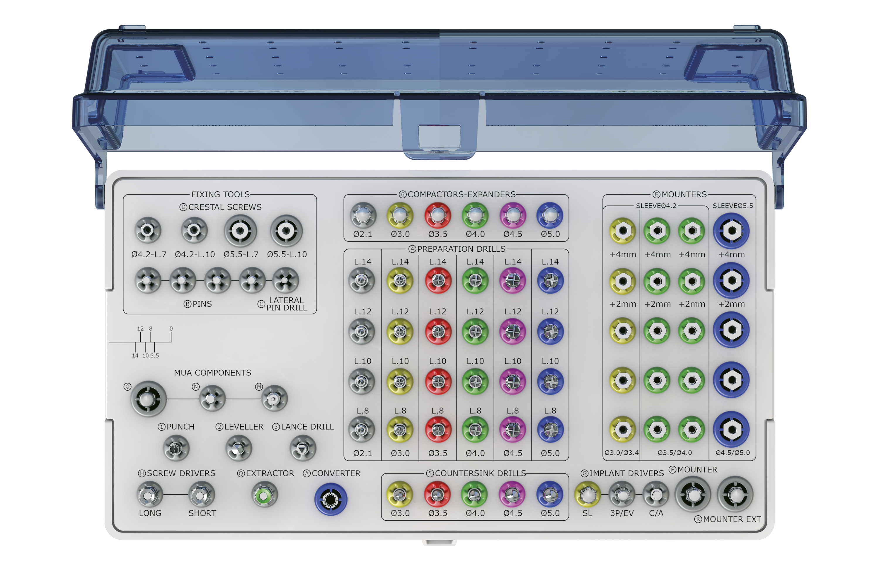Навигационный набор содержит маркированные фрезы, адаптер для фрез, костные компакторы-экспандеры, широкий ассортимент различных ключей, конвертеры, мукотом, маунтеры, крестальные винты, фрезу для крестальных винтов, риммер, экстракторы, универсальный ключ-трещотку, инструменты для мульти-юнит абатментов.