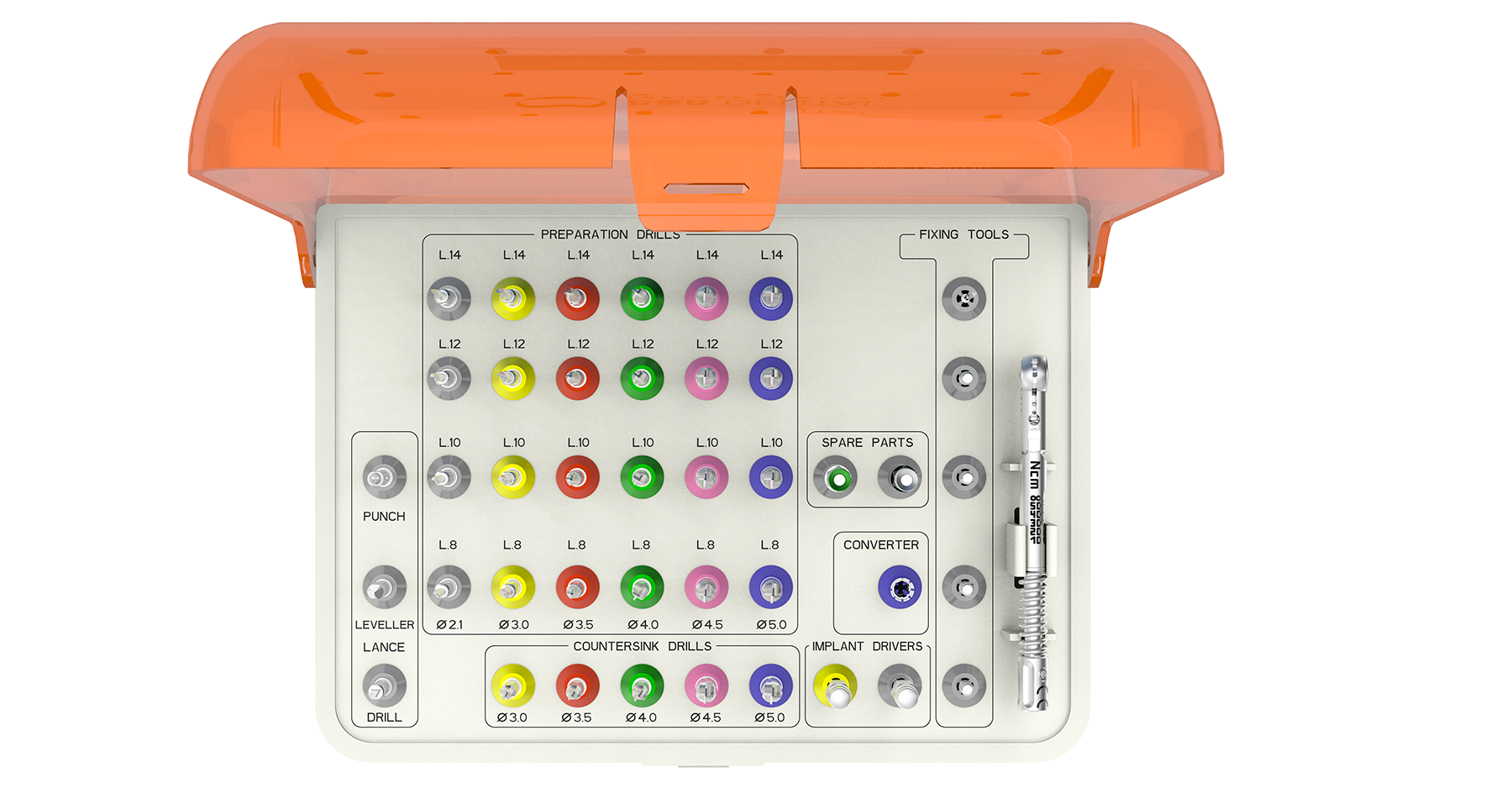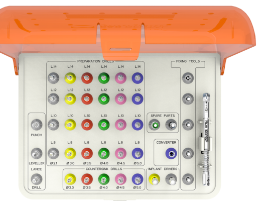 Продуманное эргономичное расположение и яркая цветовая маркировка гнезд элементов набора навигационной хирургии B&B Dental позволяют врачу быстро и без ошибок выбрать именно тот инструмент, который необходим в данную секунду. Это помогает хирургу-стоматологу дополнительно сократить время операции и не допускать ошибок, связанных с путаницей хирургических инструментов.