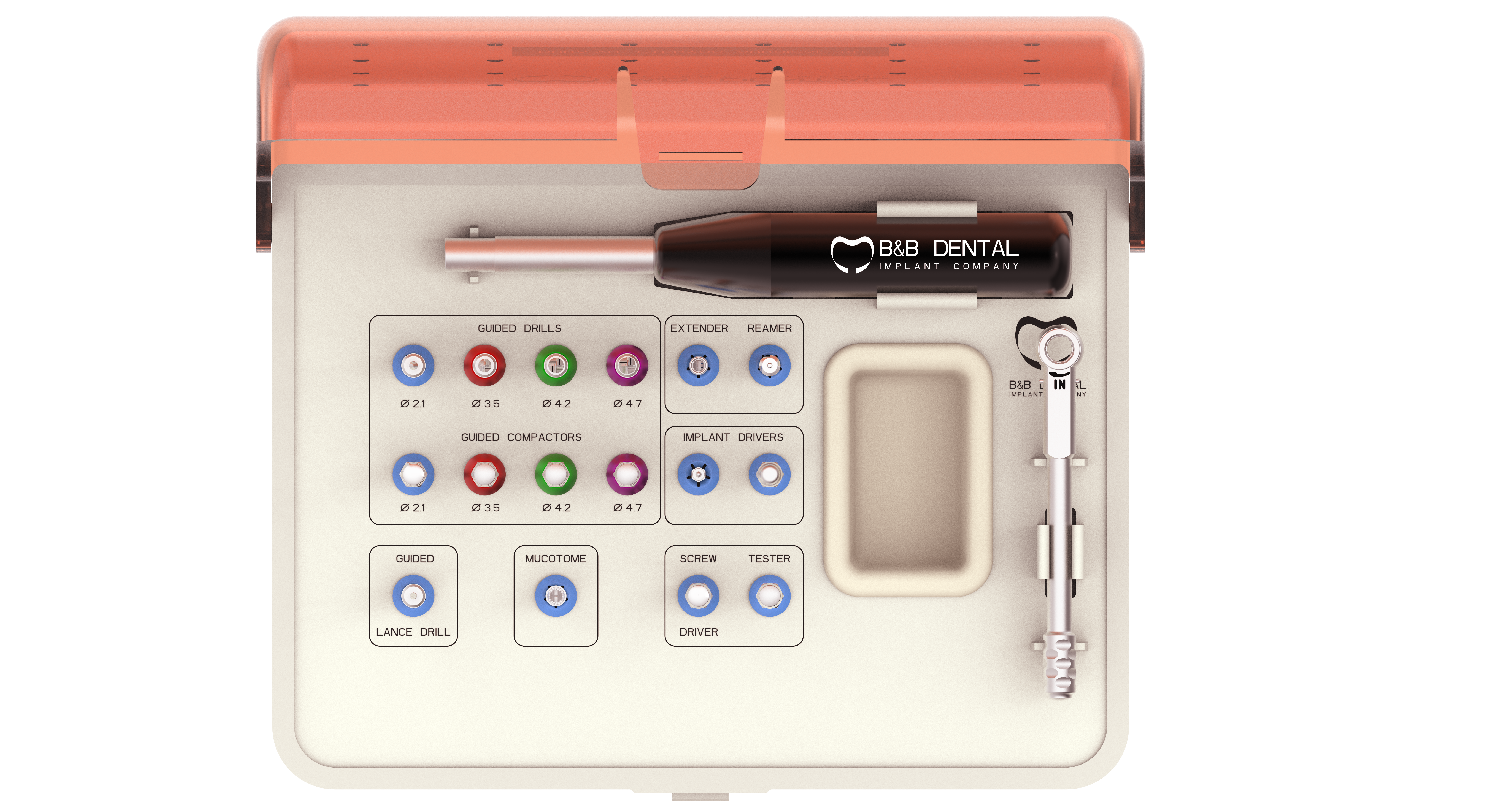 Набор Pterygo B&B Dental оснащен фрезами (для классического и навигационного протокола), ключами и компонентами для установки линии Pterygo. Компоненты набора обеспечивают оптимальную и функциональную установку имплантатов этой линии. Инструменты специально разработаны для данной анатомической области и формы устанавливаемого имплантата.