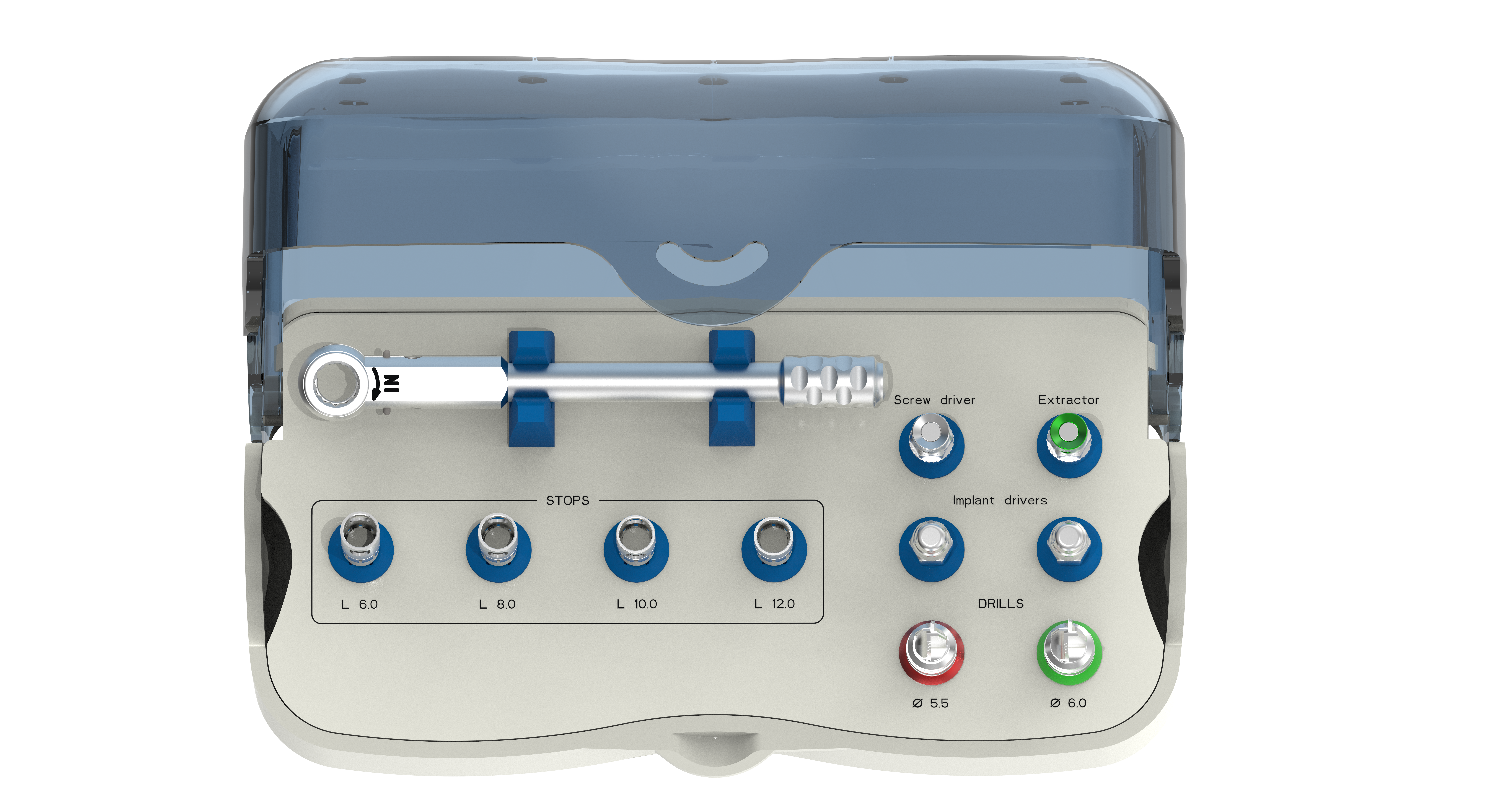 Возможность стерилизации хирургического инструмента непосредственно в корпусе набора сокращает время процедуры дезинфекции и исключает потерю компонентов набора. Корпус хирургического набора для установки имплантатов линейки WIDE изготовлен из специального полимерного материала, который выдерживает стерилизацию водяным паром при температуре до 121°С/250°F.