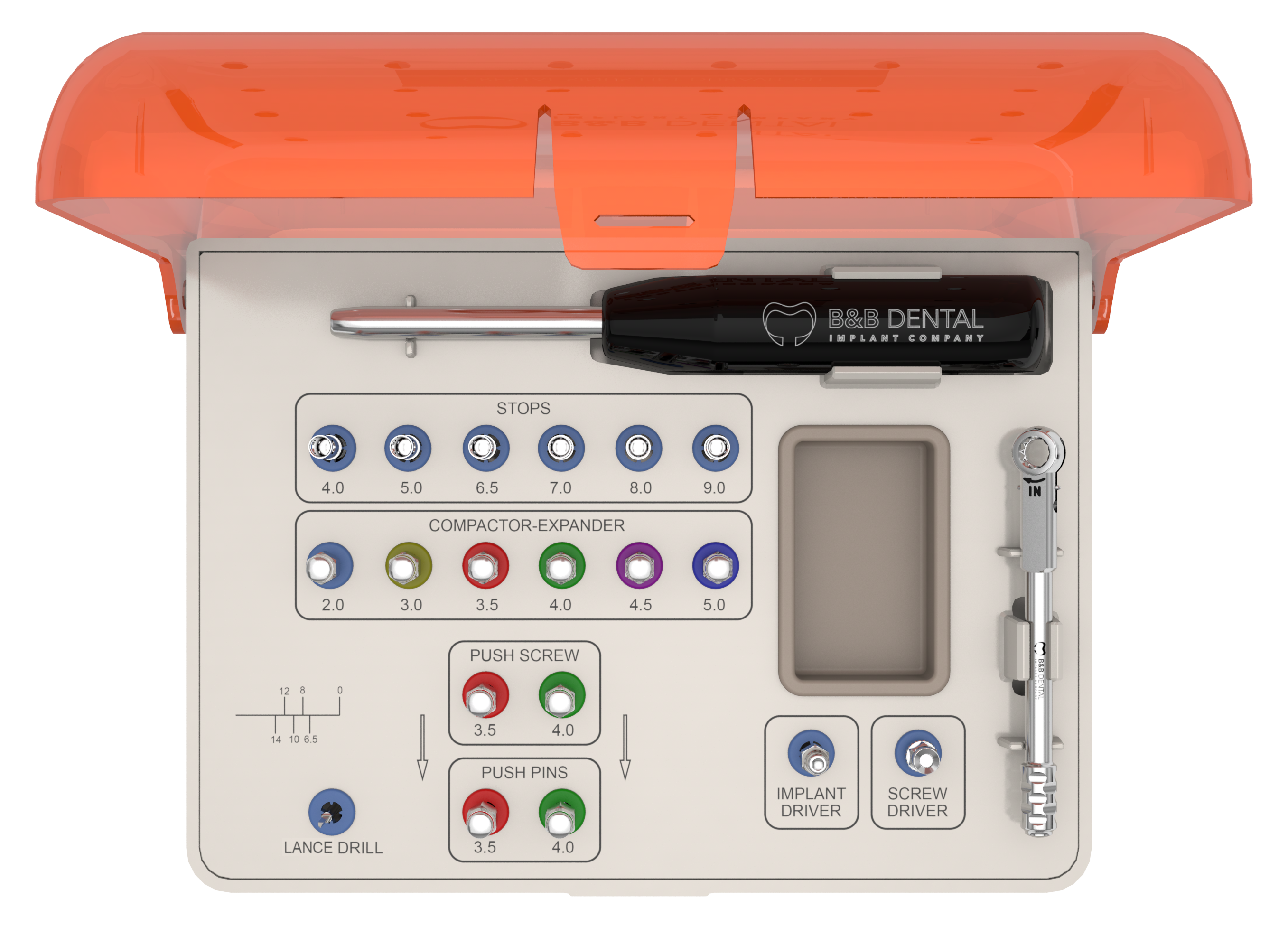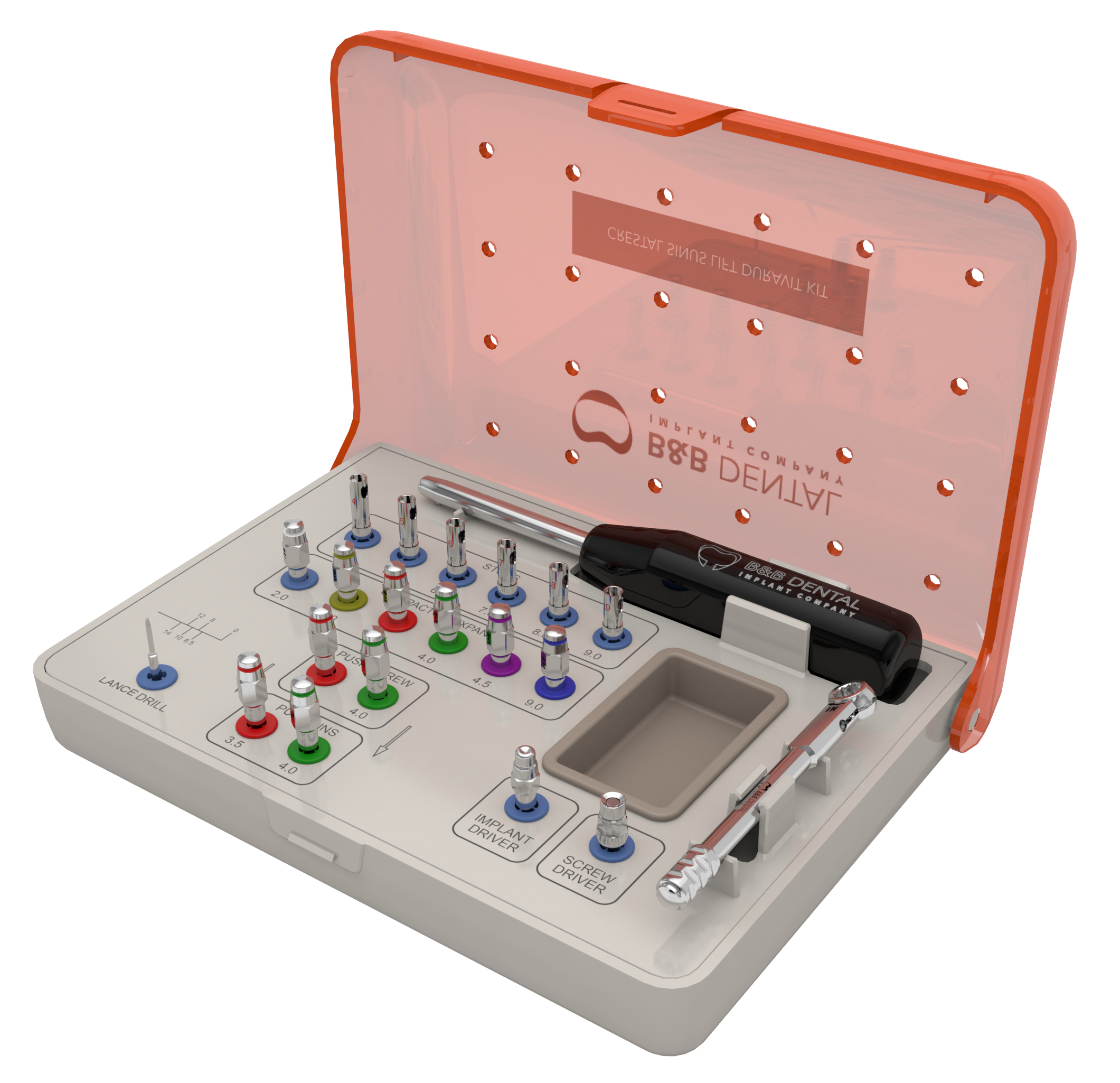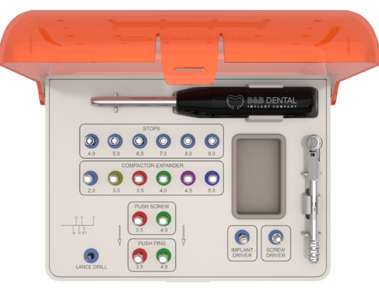 Эргономичное расположение и цветовая маркировка гнезд элементов хирургического набора для синус-лифтинга B&B Dental позволяют врачу быстро и без ошибок выбрать именно тот инструмент, который необходим в данную секунду.